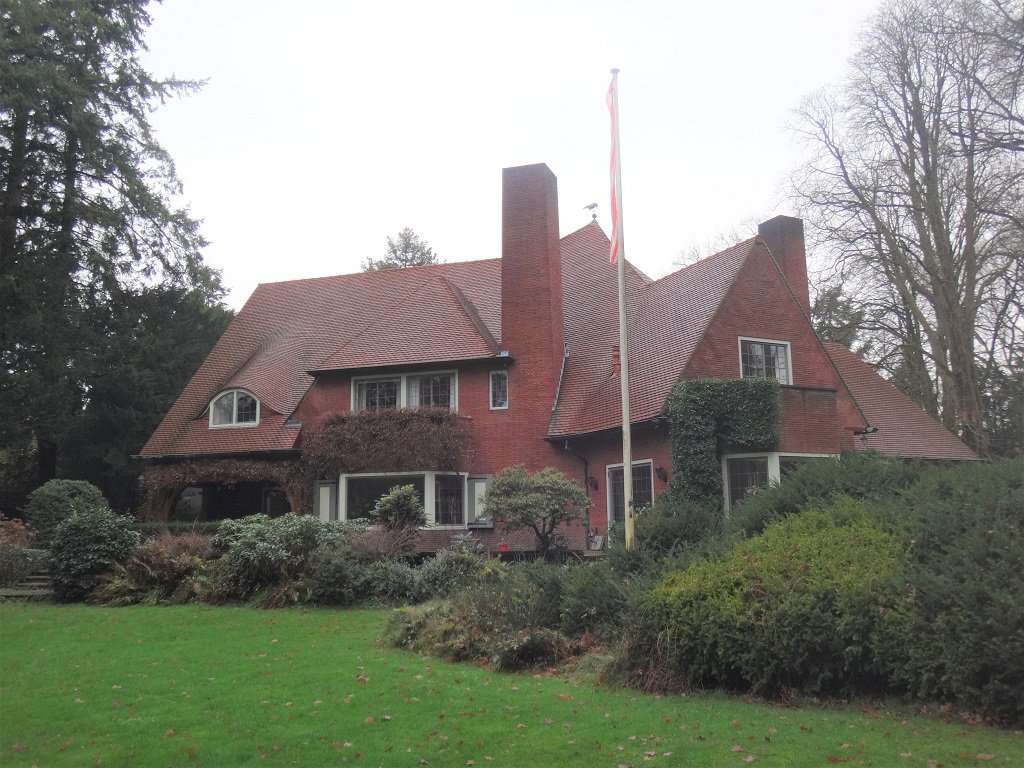 We zien een prachtig lijnenspel van verspringende en golvende leien daken, rechte en gebogen bakstenen gevels met erkers en balkons, leipannen en bakstenen van bijna eenzelfde oranjebruine kleur. Aan het einde van een oprijlaan treft men aan de zijkant van het huis een fraaie houten voordeur met daarnaast een regenwaterton die bijna alle Rebelhuizen siert.