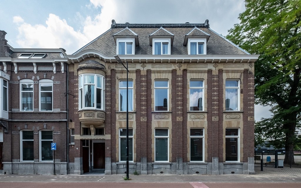 In de bijzondere gevel vallen de rijk versierde pilasters op. Tussen deze pilasters trekken de verticaal gerichte natuurstenen omlijstingen van de vensters op de eerste en tweede bouwlaag alle aandacht. Ook de ronde erker, afgedekt en gedragen door veel natuursteen mag gezien worden. De gootlijst maakt ter hoogte van deze erker een sierlijke buiging voor al deze neoklassieke schoonheid en voor de architect die naamloos achterbleef. Het pand, gebouwd in 1905, is een rijksmonument.