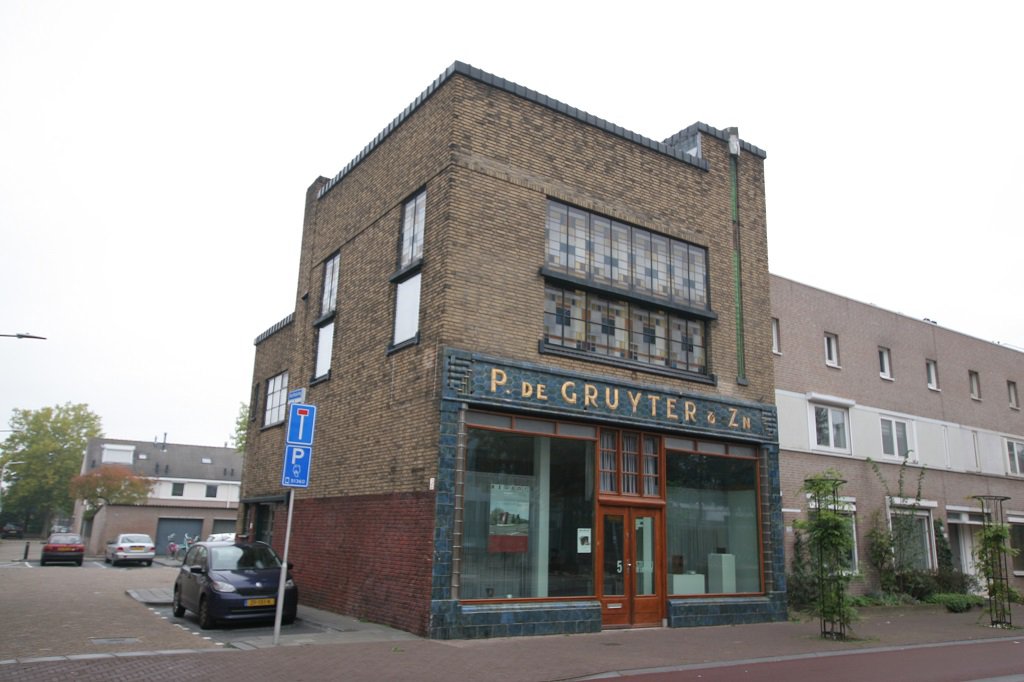 De kubusvormige winkel heeft een rechthoekige plattegrond en bestaat uit twee bouwlagen met een plat dak met aan de voorkant en zijkanten een borstwering. De voorgevel heeft op de begane grond een blauw gevlekt tegelwerk met speciaal gevormde hoek- en lekdorpeltegels afkomstig van de fabriek ‘De Porceleine Fles’ uit Delft. Boven deze tegels zien we in goudkleurige kapitalen de firmanaam ‘P. de Gruyter en Zn’.