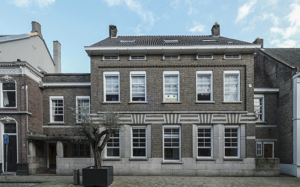 Van der Valk ontwierp in 1929 de complete huidige gevel in de stijl van de Nieuwe Zakelijkheid, met velden van baksteen, afgewisseld met graniet. De horizontale geleding valt o.a. op door een bloktandlijst, de mezzanino en de daarboven uitstekende gootlijsten. Op de verdieping staan de vensters binnen een groot spaarveld. Het hoofdgebouw heeft een zadeldak. Links zien we de teruggelegen hoofdingang met een granieten afdak, ondersteund door zuilen en opgelegd in de muur van het hoofdgebouw.