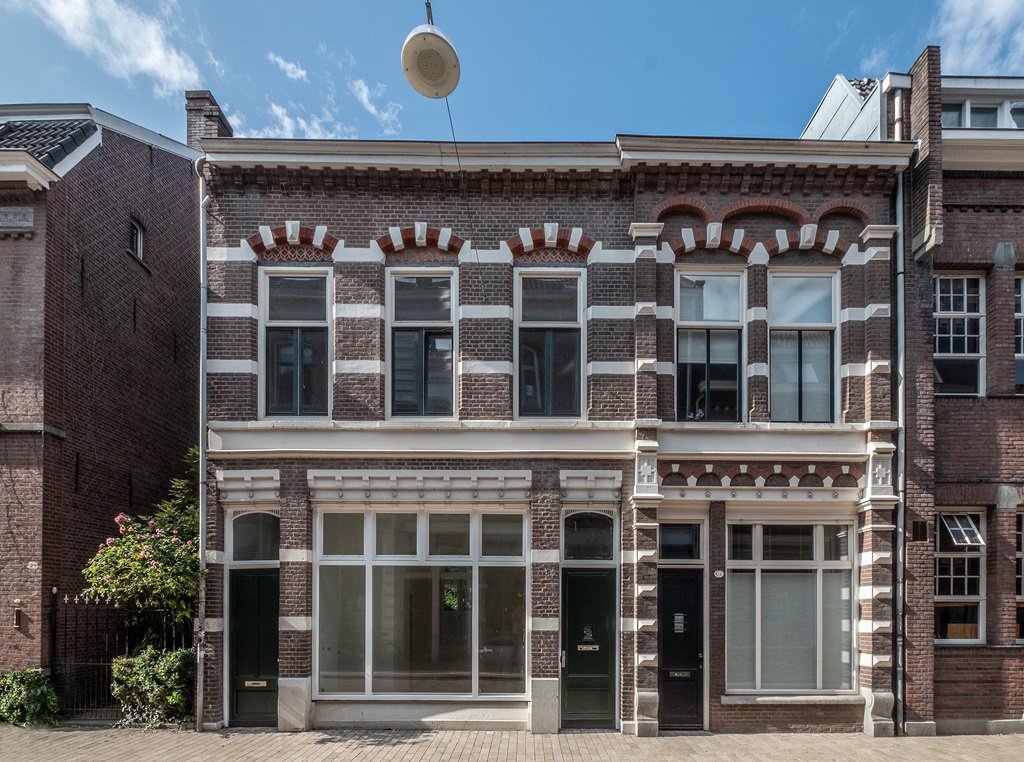 Wat hebben we deze keer in beeld gebracht? Zijn deze panden afzonderlijk gebouwd of was er te weinig ruimte in deze straat gereserveerd om ook nr. 67 aan zijn trekken te laten komen? Moest dat gecompenseerd worden met een hele drukke gevel waarin de architect al zijn kunnen kon tonen? Hadden de huizen aanvankelijk vijf identieke ramen op de verdieping en twee winkels onder een met bloemmotieven versierde stalen balk beneden en is er later een voorzetgevel aan 67 toegevoegd? We weten het niet. Wel zien we dat bij huis 67 aan beide kanten van de gevel, op de scheiding, hoekrisalieten gebouwd zijn die het siermetselwerk onder de gevel omhoog lijken te houden. En vanwege dit sierwerk is ook de geprofileerde gootlijst naar voren gekomen. Een drukte van je welste kenmerkt dit smal gehouden pand.