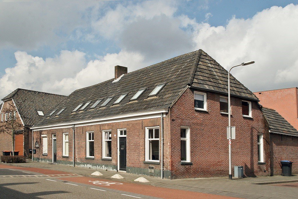 Een van de slopershamer geredde voormalige langgevelboerderij in een verstedelijkte omgeving.